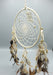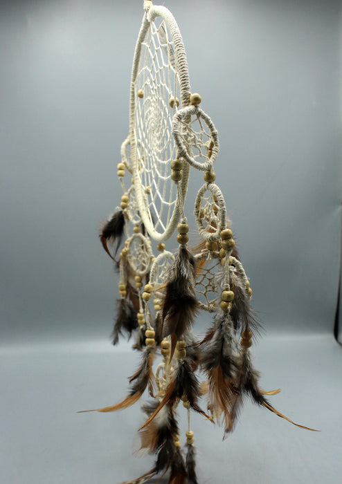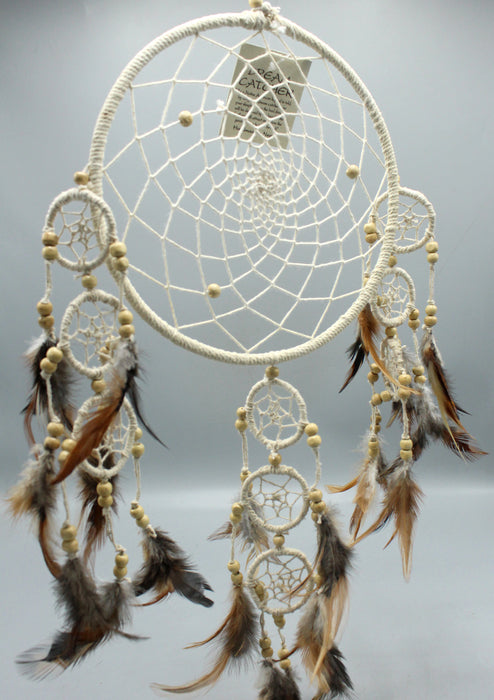 This medium sized mandala dream catcher is hand made in Nepal. It has multiple mini dream catchers attached to it. It is made using a hoops, hemp and cotton mixed fiber, beads and feather.The feathers used in the dream catcher come from a local poultry farm where the feathers are harvested in an humane manner.