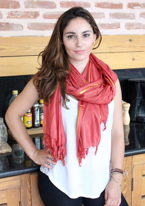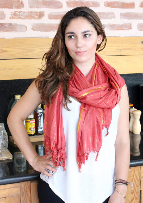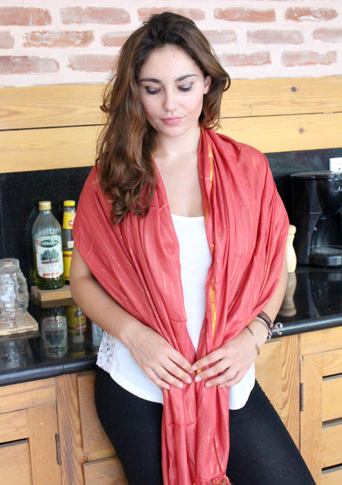 These are pure cotton shawls hand made in Nepal. . These are the perfect summer shawls that are beautiful and light weight. The color of the shawl is Coral color and the border with gold linings. This shawl goes well with any kind of casual outfits and these cotton shawls are always in fashion.