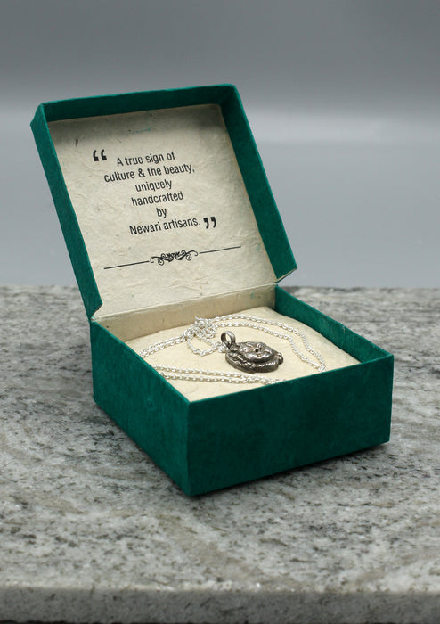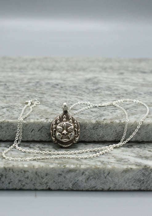 This is a handmade silver sterling Bhairav Pendant from Nepal. These designs feature Bhairava, the fierce manifestation of Shiva. He is known as the destroyer of fear, protector of timid, and protector of the eight directions of the universe. This pendant comes with 925 Sterling silver chain.