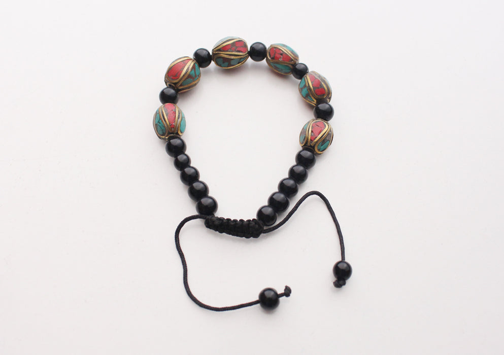 These are 6mm black beads and traditional Tibetan inlaid beads strung together to form a beautiful beaded wrist mala. These wrist malas are adjustable and can fit most wrists. The stone looks so attractive and unique. The stones are in oval shape and inlaid with faux coral and turquoise.