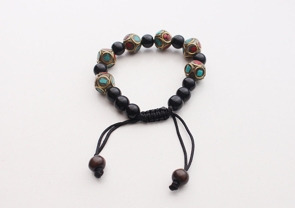 These are 8mm black beads and traditional Tibetan inlaid beads strung together to form a beautiful beaded wrist mala. These wrist malas are adjustable and can fit most wrists. This is a unique design and can wear casually.