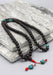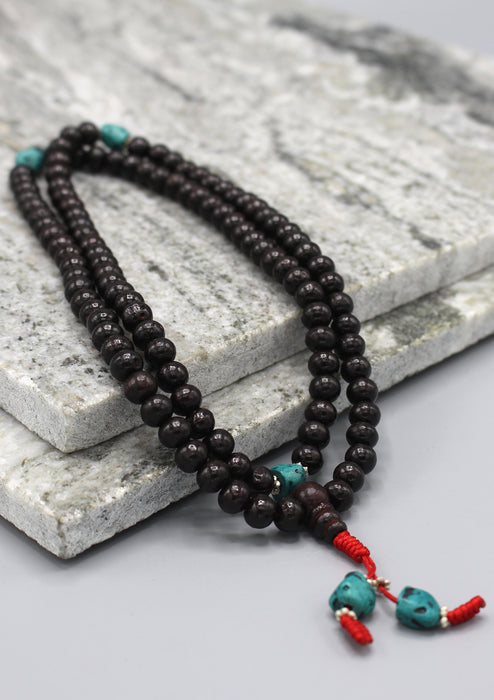 This is a beautiful Rose Wood 108 Prayer beads strung together in an nylon thread with Turquoise beads in a red thread. The mala has turquoise spacer and looks elegant..