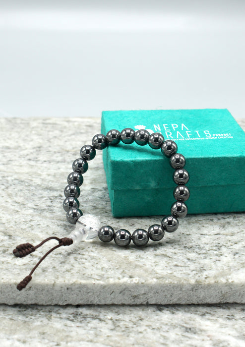 This is a black shiny Terahertz beads bracelet. These Terahertz beads bracelets helps protect the wearer from harmful radiation and electromagnetic smog. The terahertz beads are said to increase the blood circulation, stimulating the metabolism. This bracelet is from Nepal.