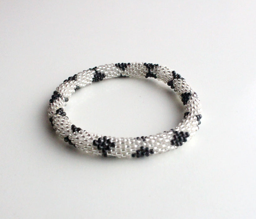 Our woman artist carefully hand-strung this fairly traded roll on bracelet. Made with the finest quality Czech and Japanese beads, the bracelet stretches as you roll it over your wrist. It fits most wrists as it is adjustable and will roll over around your wrist.