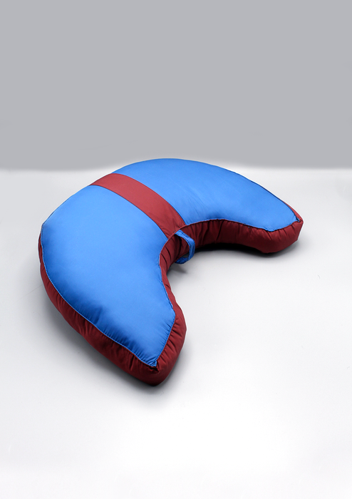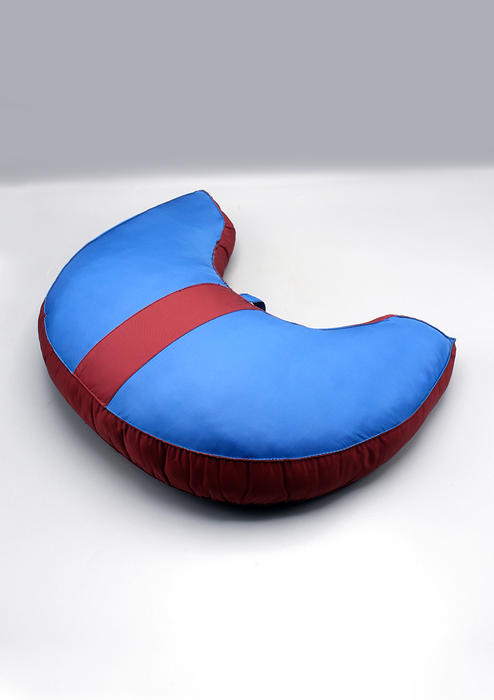 This is a crescent-shaped meditation cushion in blue and red colors. The curved design supports natural alignment of the spine, helping reduce strain on the knees, ankles, and hips during seated meditation. Filled to provide firm yet comfortable support, it allows for extended sitting in cross-legged or lotus positions. The outer fabric is durable and soft to the touch, making it suitable for daily practice at home or in a studio.