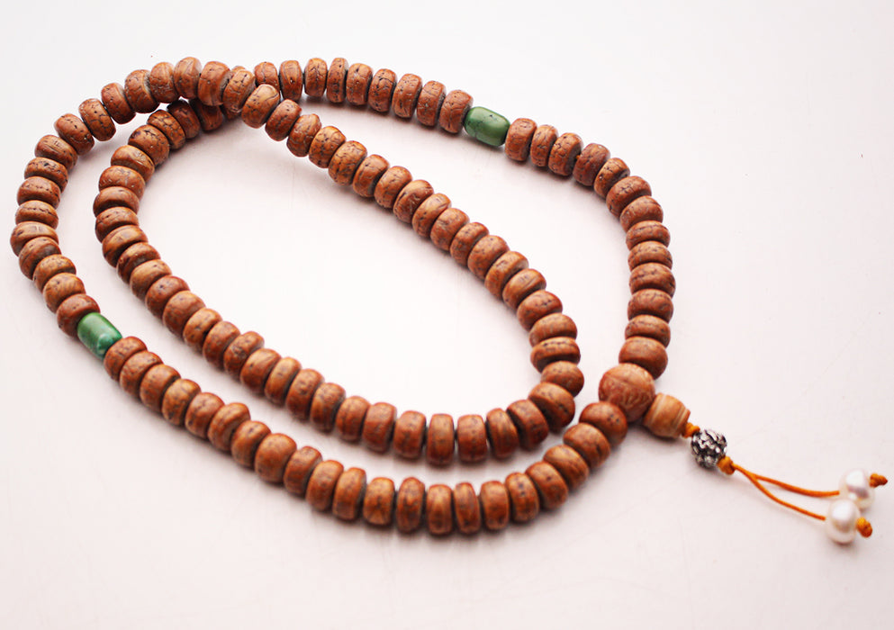This tibetan prayer mala is made of 108 bodhi seeds along with guru bead strung together with a strong thread. To make the counting and praying easier, there are two faux turquoise beads spacer in this mala. The mala has beautiful tassel with white pearl.
