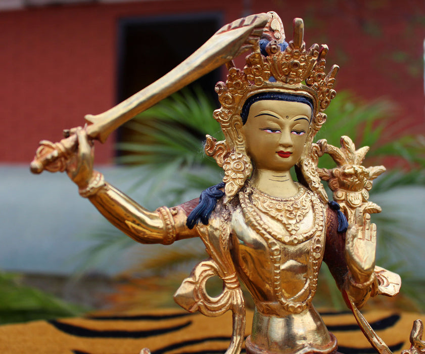 This is a Partly Gold Plated 8.5 Inches High Copper Manjushri Statue. The statue is handmade in a traditional way employing lost wax technique. The artist who made this statue is now a forth generation statue maker and is extremely talented which can be seen in the fine, intricate and smooth details of the statue.