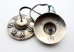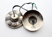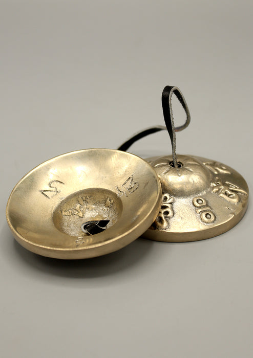 This is a Om Mani Padme Hum embossed metal tingshas or cymbals. Tingshas are two metal small cymbals joined by leather strap. It is commonly used by Tibetan practitioners during prayers and ritual ceremony. These two metal cymbals are struck together to produce a high pitched clear tone. Tingshas are quite thick which helps in producing long ringing sounds of a bell.
