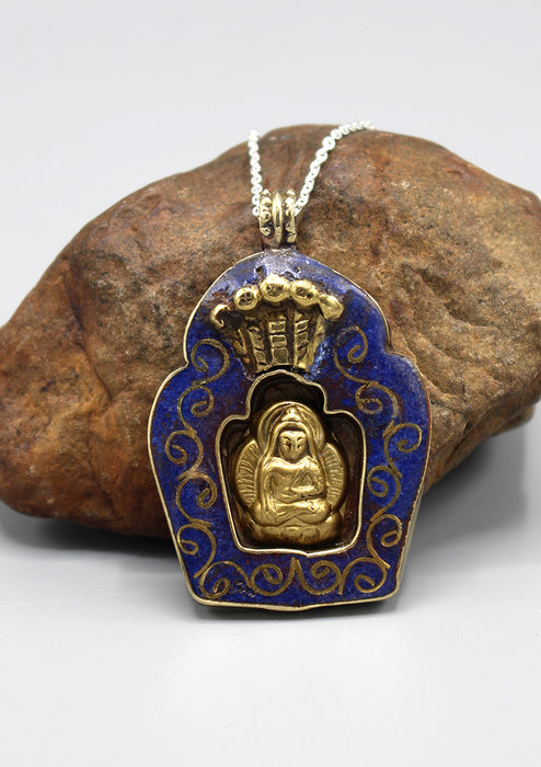 These are the beautifully made pendant with small brass Shakyamuni Buddha inside it. The pendants are painted with faux Coral and Lapis. This pendant comes with sterling silver chain.