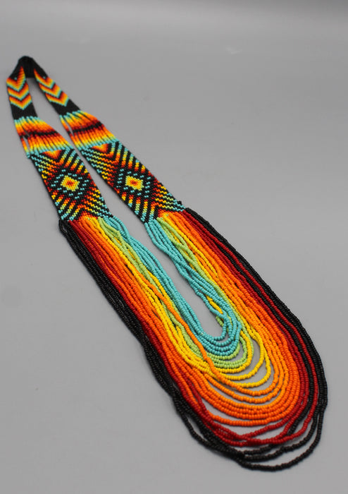This is a colorful hand crochet glass beads necklace hand made in Nepal. These types of necklace is very popular in Nepal. This glass beaded necklace can be best suited with traditional dress and for any traditional occasion. The thick necklace with multilayered beads looks beautiful. The necklace is beaded with red, black, orange, blue, yellow and green.