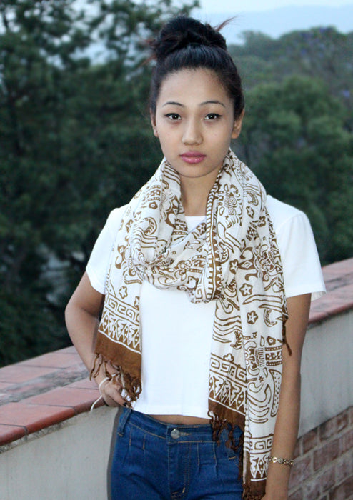 This is a cotton shawl handmade in Nepal using batik technique. The shawl has beautiful pattern printed with Brown color and Brown and white fringed at the border. Batik is a "resist" process for making designs on fabric. The artist uses wax to prevent dye from penetrating the cloth, leaving "blank" areas in the dyed fabric. The process, wax resist then dye, can be repeated over and over to create complex multicolored designs.