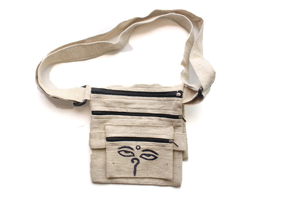 This side carry bag is made from cotton handmade in Nepal. This bag is useful for traveling as it has easily accessible four pouches with zipper closure that ensures the safety of your accessories.