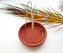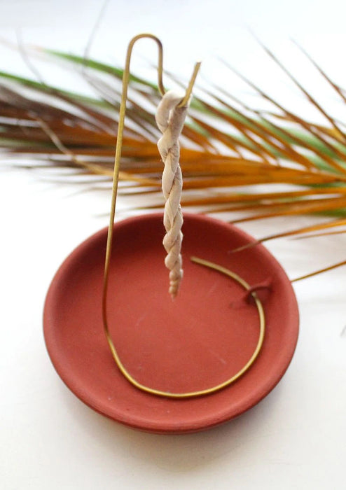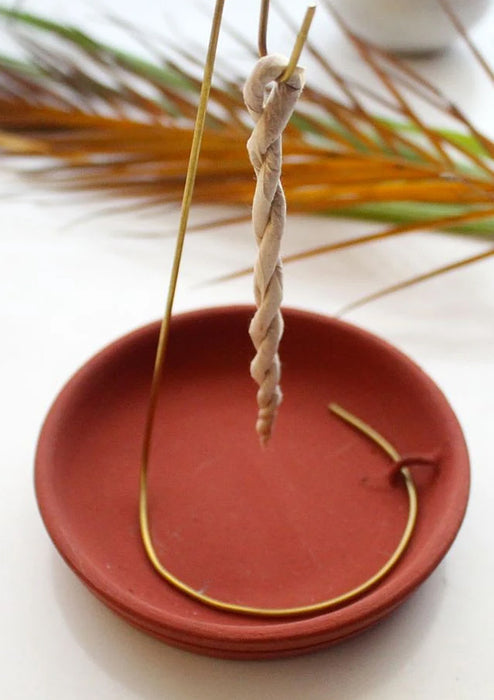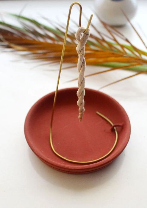 This is a brass stand and a ceramic base plate. The ceramic base plate fits the brass stand which goes through the top part of the rope incense. This way your incense hangs on the brass stand and the ash falls on the base plate.