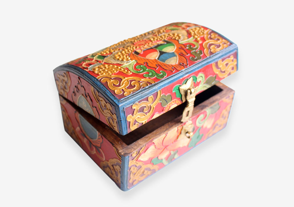 These beautiful Tibetan boxes are hand crafted by one of the Newari Communities of Bhaktapur Nepal, The Prajapatis. After the wooden box is complete, it is then hand painted by the Buddhist community of Tamang in Kathmandu Valley. It takes upto 2 days to complete one box.