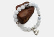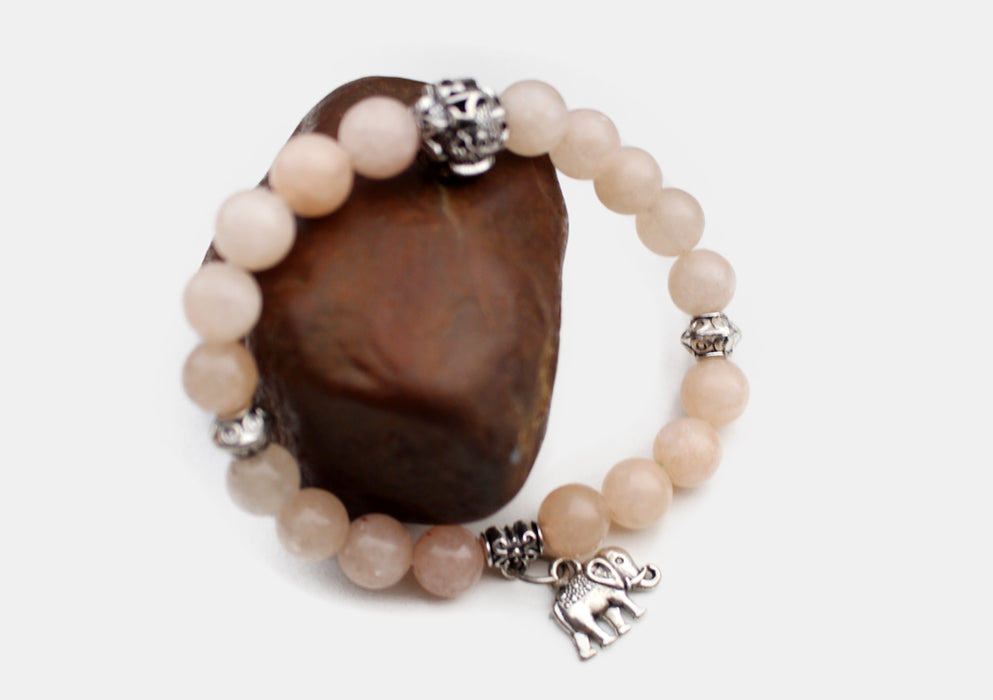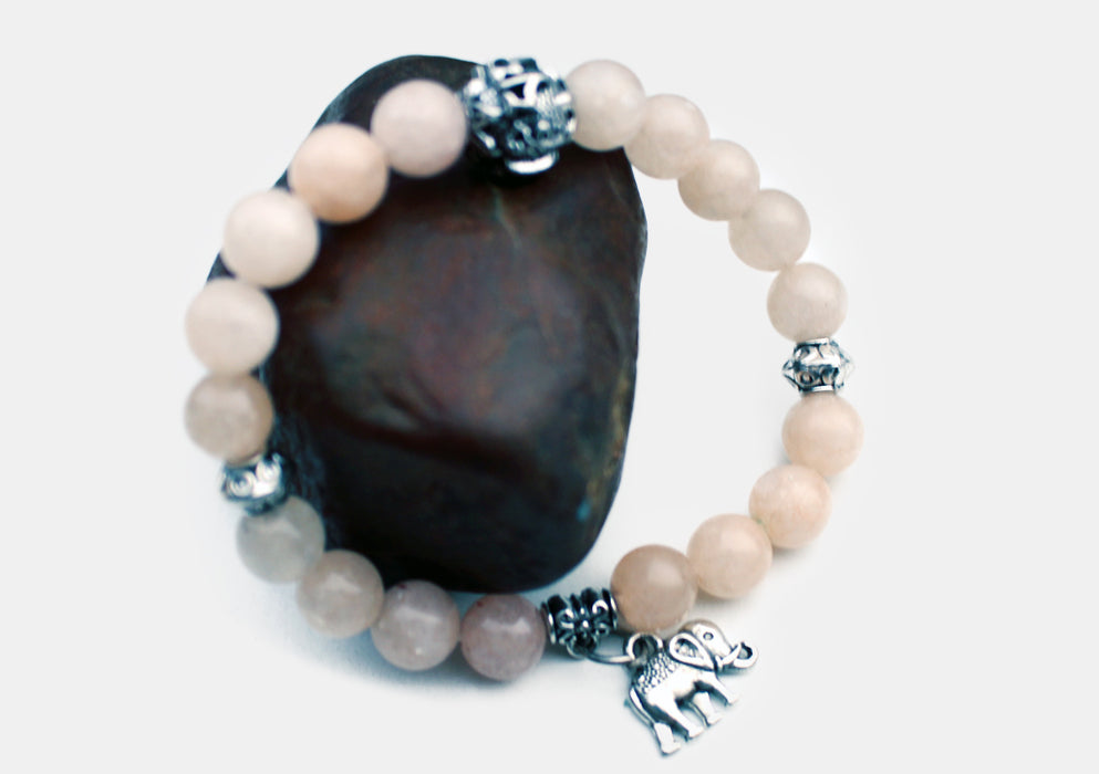 All the beaded stone bracelet has small Om Mani mantra carved round counter. The Rose Quartz bracelet has Buddha head counter with elephant charm.