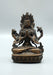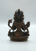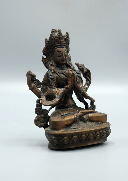 The two hands of the Chenrezig is folded in the posture of Namaste and the other two hands are raised close to the shoulders holding lotus and garland in an infinite loop. The crown covers the head and flows down to the neckline. Two big floral earrings are pierced in the ears which elongates down the shoulders. The Chenrezig is seated in the EK Padma or Single Lotus. This statue is completely brown with hints of black in the shoulders and is shiny.