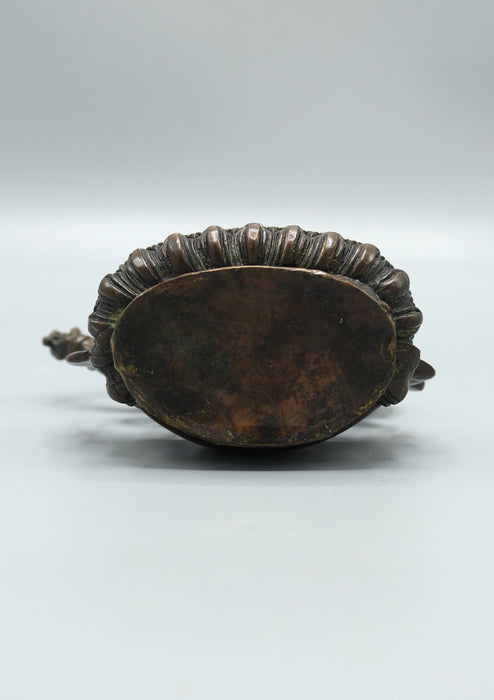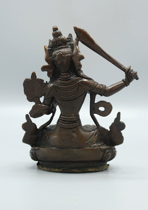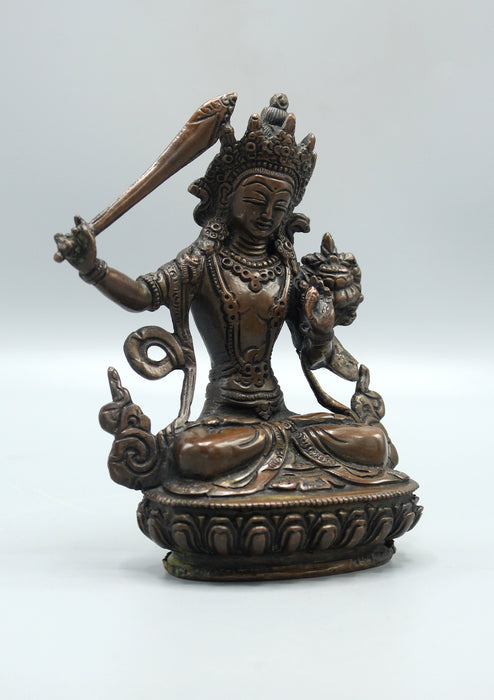 This is a copper oxidized 6 Inches High Statue of Manjushree sitting on a lotus. The statue is handmade in a traditional way using a clay dye. The artist who made this statue is now a forth generation statue maker and is extremely talented which can be seen in the fine, intricate and smooth details of the statue.