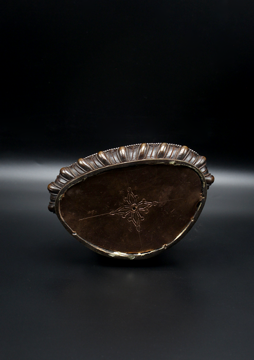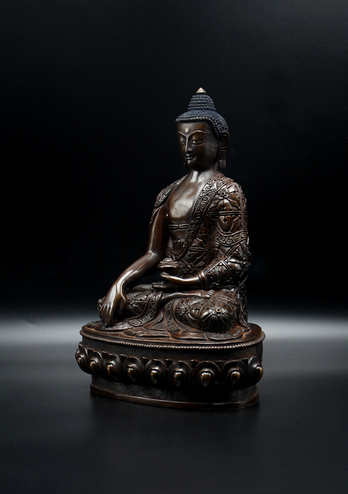 Intricately detailed, the statue showcases ornate floral patterns on the robes, a serene expression, and a precisely sculpted alms bowl in his palm, symbolizing detachment and compassion. The ushnisha on his head, along with elongated earlobes, reflects spiritual wisdom and renunciation. Resting on a lotus base, this statue embodies purity and spiritual elevation. The rich antique copper finish enhances its timeless elegance, making it an inspiring centerpiece for meditation spaces, shrines, or as a sacred offering.