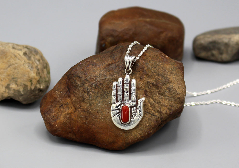 This is a finely carved Tibetan hamsa pendant handmade in Nepal. The beautiful coral inlaid looks elegant. Hamsa is a protective sign. It is believed that Hamsa brings happiness, luck, health, and good fortune. The pendant is carved finely. The pendant is made of silver and it comes with silver sterling chain.