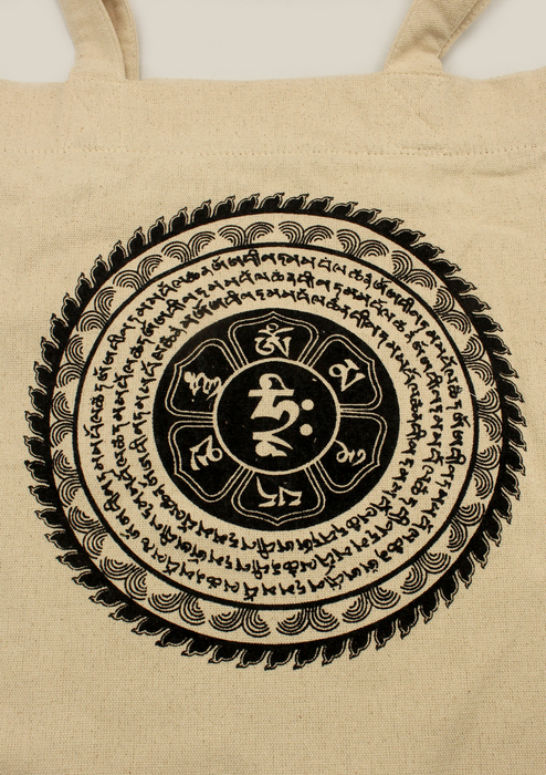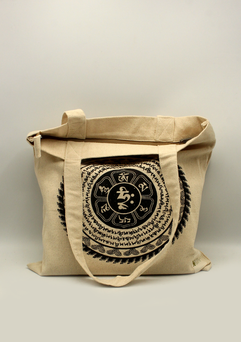 This beautiful bag is handmade in Nepal. This bag is made from cotton. This bag can be used to keep your purse, cell phones, make up kits, notebooks, umbrella or any other items. The bag has a mandala and Om Mani mantra in the middle.