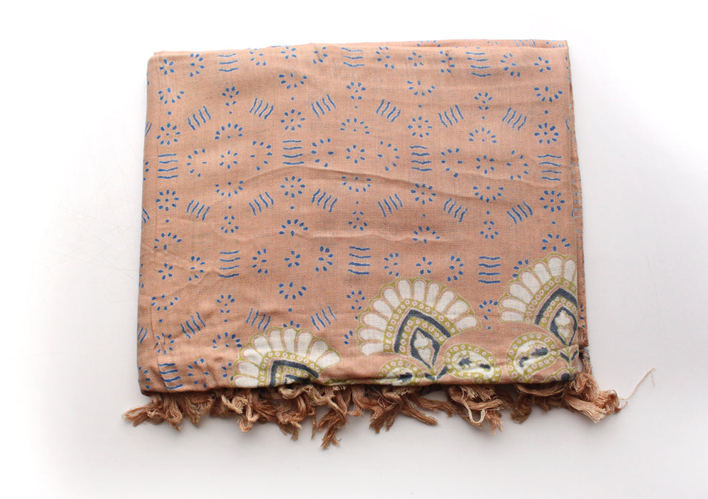 Cream and Blue Mandala Print Cotton Summer Shawl/Scarf with Fringe