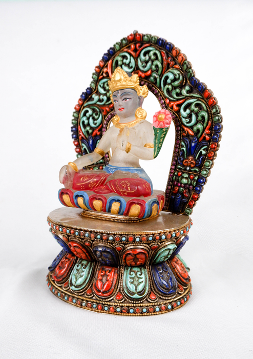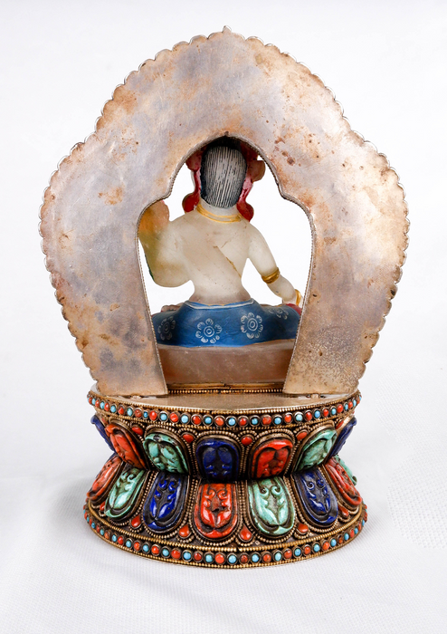 Elevate your spiritual space with the exquisite "Silver White Tara Statue with Gemstone Accents." This finely crafted Tibetan artwork depicts the compassionate White Tara, radiating purity and enlightenment. The delicate silver details enhance her serene presence, while the genuine coral, turquoise, and lapis lazuli stones bring a touch of symbolic significance and elegance to the piece. Standing at 19cm in height, this creation embodies a harmonious blend of spirituality and artistry, making it a captivating and meaningful addition to your collection. Immerse yourself in the divine energy and profound symbolism that this statue exudes, as it becomes a focal point for contemplation and devotion.