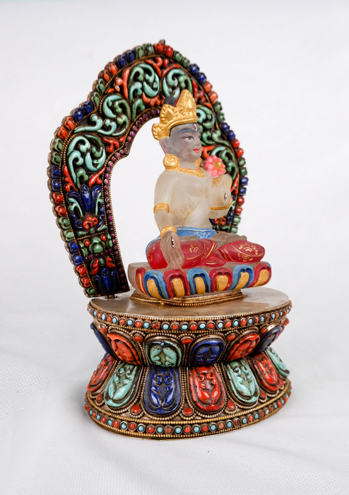 Crystal White Tara Statue Seated on the Silver Sterling Throne with Gem Stone Inlaid