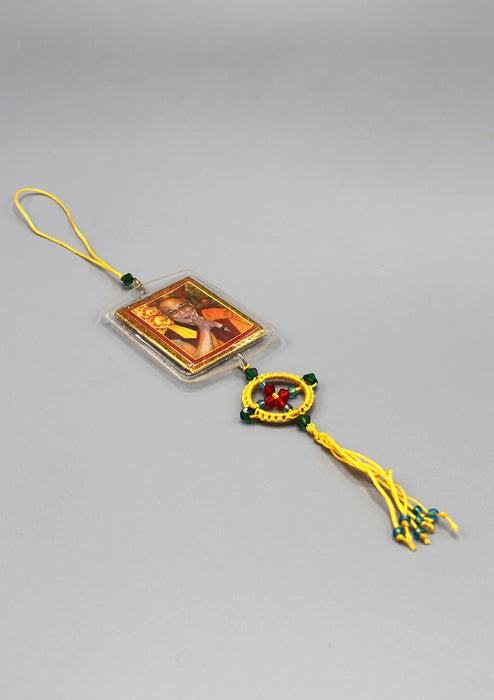 This is a car hanging protection amulet. This amulet hanging is to be hanged in the real view mirror. This amulet has a picture of Dalai Lama is placed above a paper folded into many folds and is covered with hard plastic cover. In the back side a picture of Kalachakra is placed. This car hanging protects against accidents and evil.