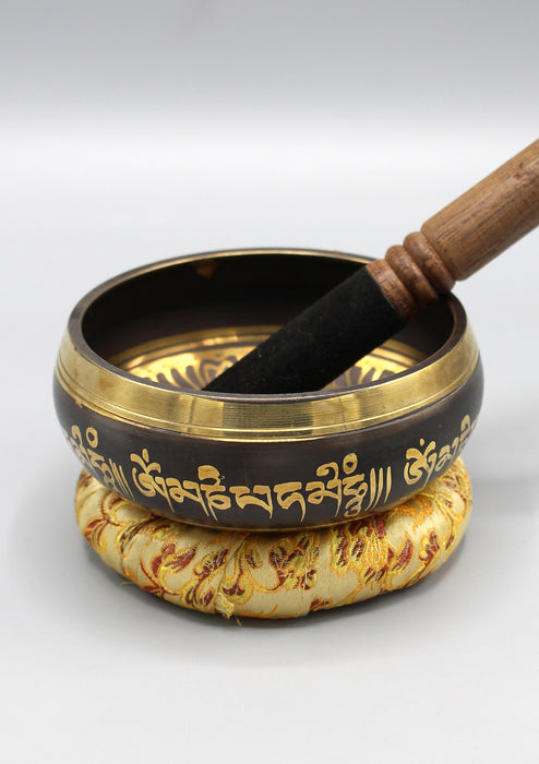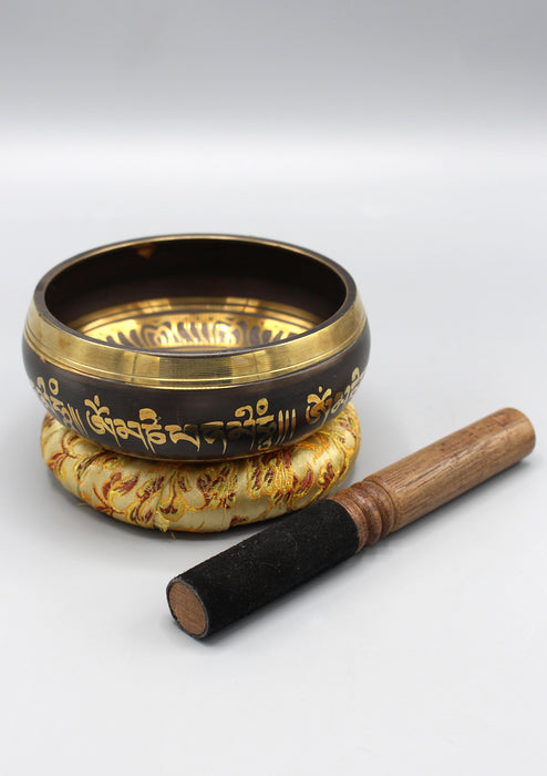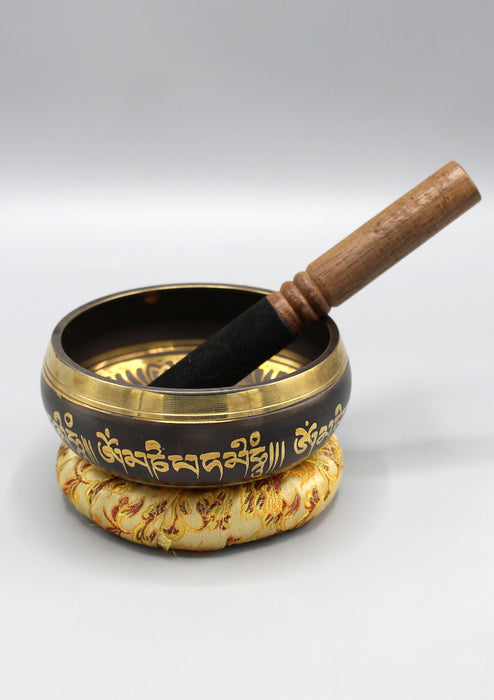 This singing bowls is etched and engraved with various symbols of Tibetan Buddhism. The engraving of double dorjee in the inner center, the etching of Om Mani Mantra and the Double Dorjee on the outer look fine and exquisite. The singing bowl comes with Ring cushion and wooden mallet.