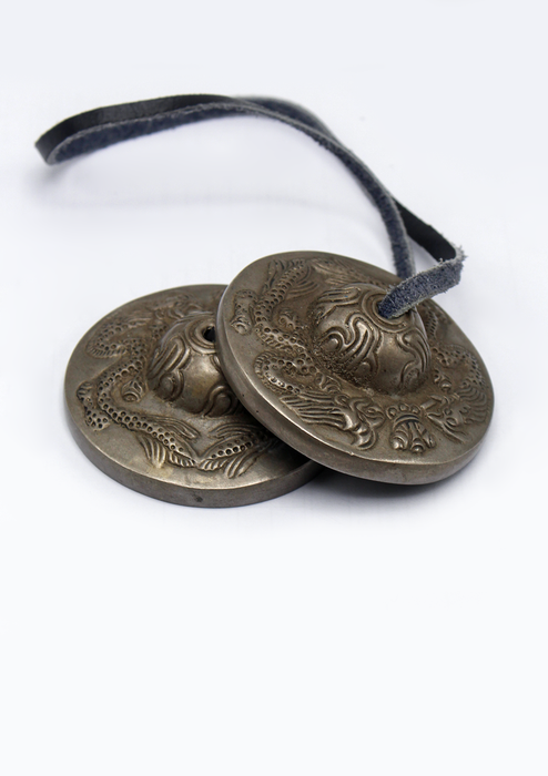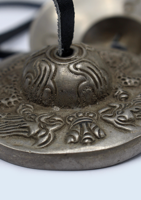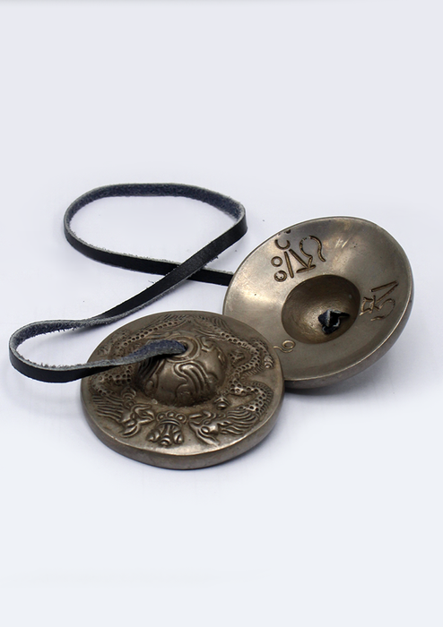 This is a dragon embossed metal tingsha or cymbals. Tingshas are two metal small cymbals joined by leather strap. It is commonly used by Tibetan practitioners during prayers and ritual ceremony. These two metal cymbals are struck together to produce a high pitched clear tone. Thingsha cymbals are quite thick which helps in producing long ringing sounds of a bell.