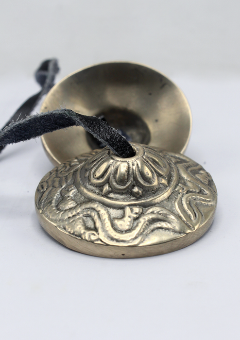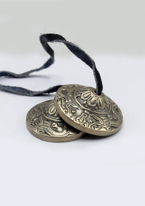 Tingshas are two metal small cymbals joined by leather strap. It is commonly used by Tibetan practitioners during prayers and ritual ceremony. These two metal cymbals are struck together to produce a high pitched clear tone. Thingsha cymbals are quite thick which helps in producing long ringing sounds of a bell.