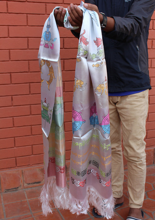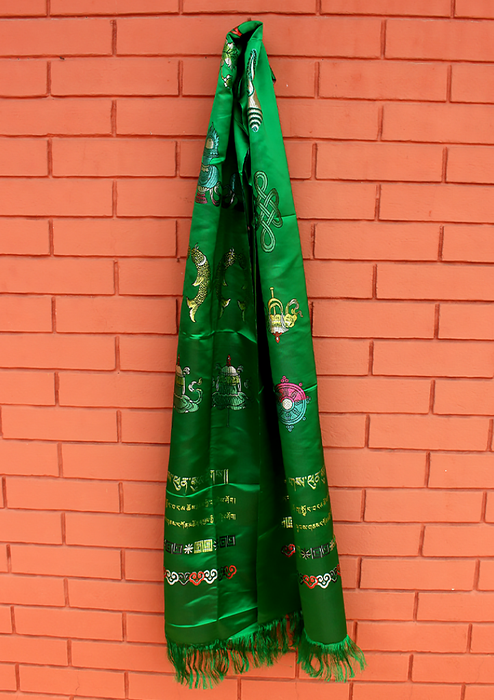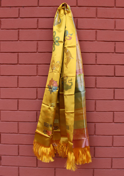 This khata is embroidered with Tibetan eight auspicious symbol and Tibetan mantras.