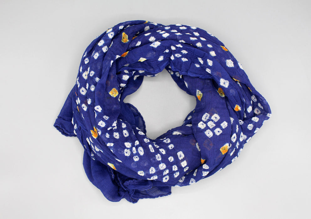 This cotton scarf is hand tie dyed with natural colors in Nepal. The fabric is soft and lightweight. It can be worn with any dresses.