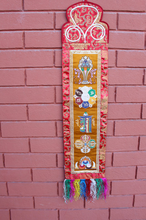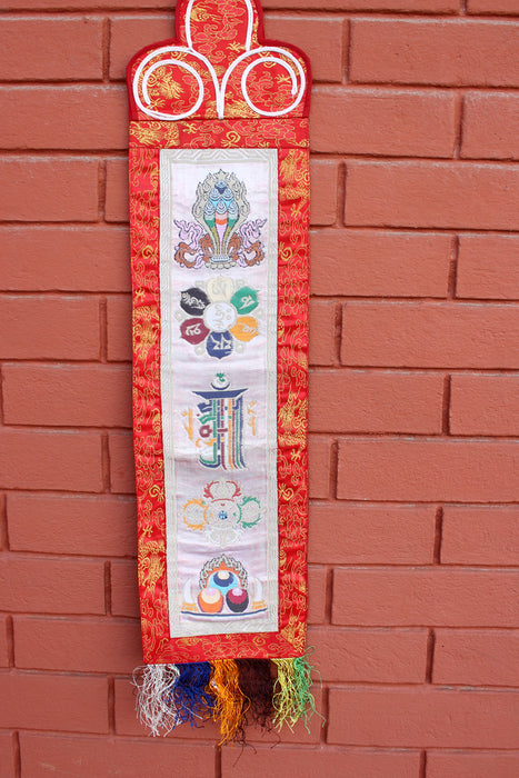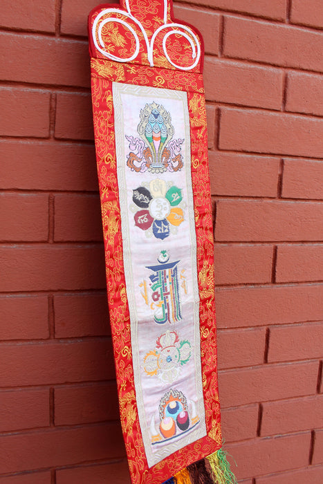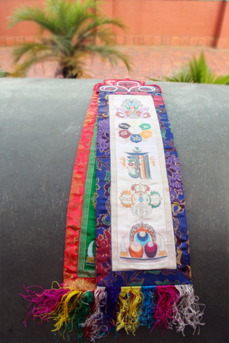 It is believed to be auspicious to have it hanging inside a house. These banners are popular among the Tibetan Buddhist and feature prominently in their altar room or living room. This banner also has 4" fringes at the bottom.