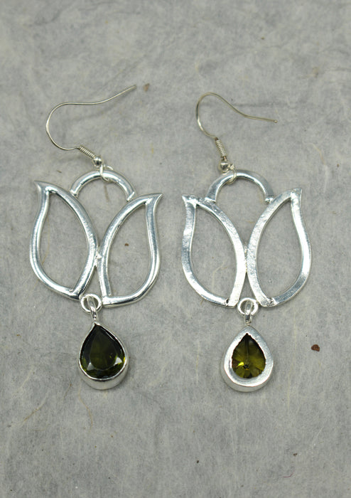 Emerald Inlaid Lotus Design Silver Plated Earrings