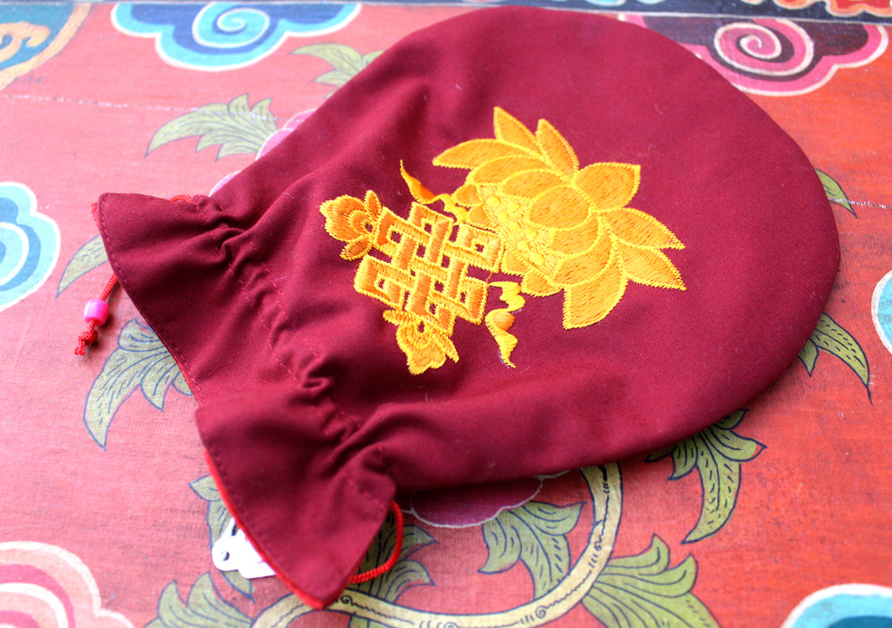This is a beautiful drawstring pouches to keep the regular and smaller items. This pouch is handmade in Nepal. An embroidery of Double Dorjee & Lotus has been made in both front and back of the bag.