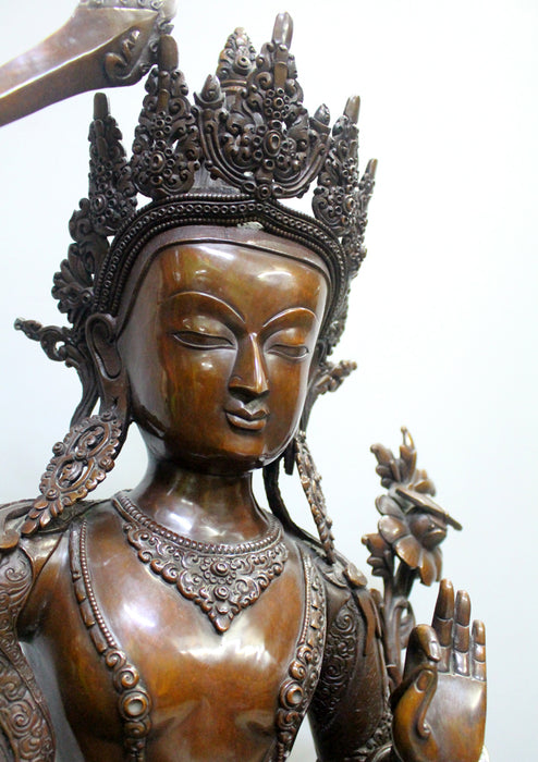 This is a 25.5 Inches High Copper Statue of Manjushree. The statue is handmade in a traditional way. The artist who made this statue is now a forth generation statue maker and is extremely talented which can be seen in the fine, intricate and smooth details of the statue. The statue has a perfect details with perfect expressions.
