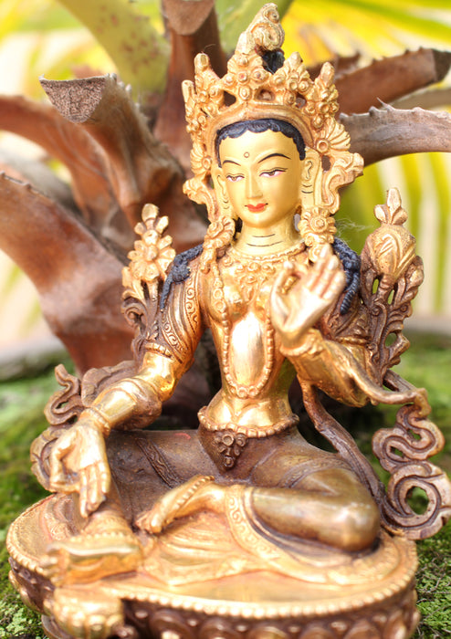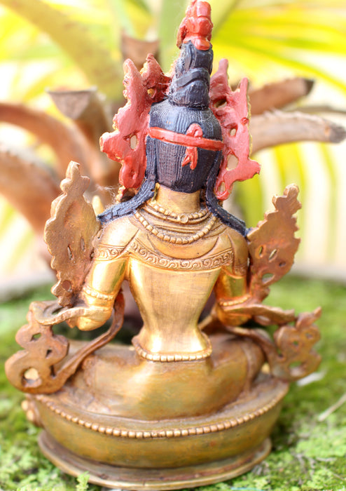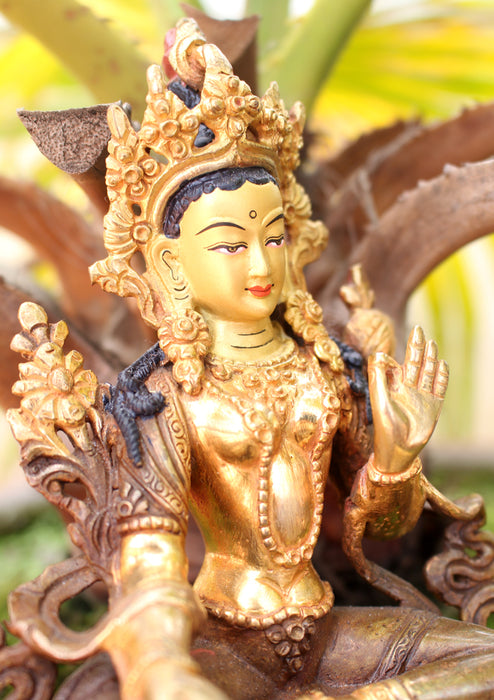 This is a gold plated copper Green Tara Statue which is completely hand crafted in Nepal. Nepalese sculptures are popular around the world since they are made with genuine ancient techniques and with the expertise of skilled craftspeople. Our sculptor is a fourth generation artist whose family has been sculpting for over a century now.