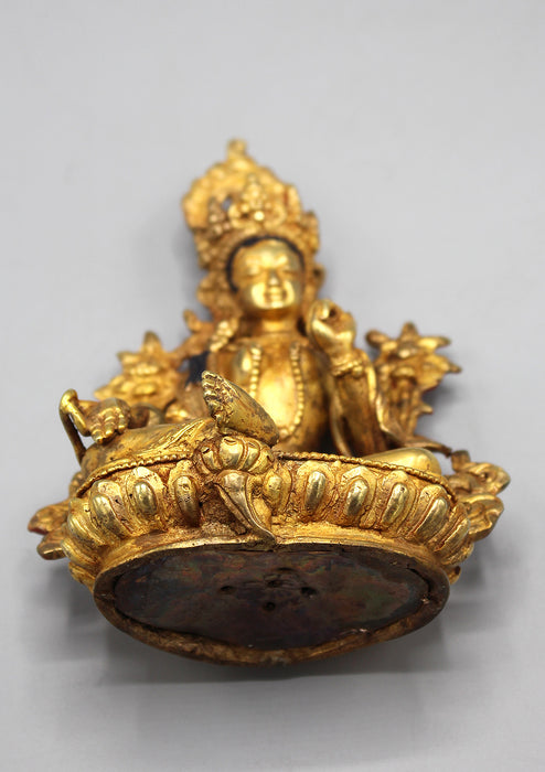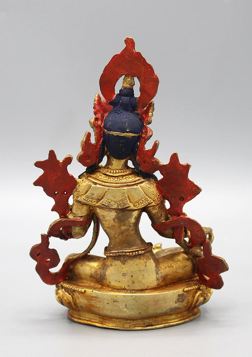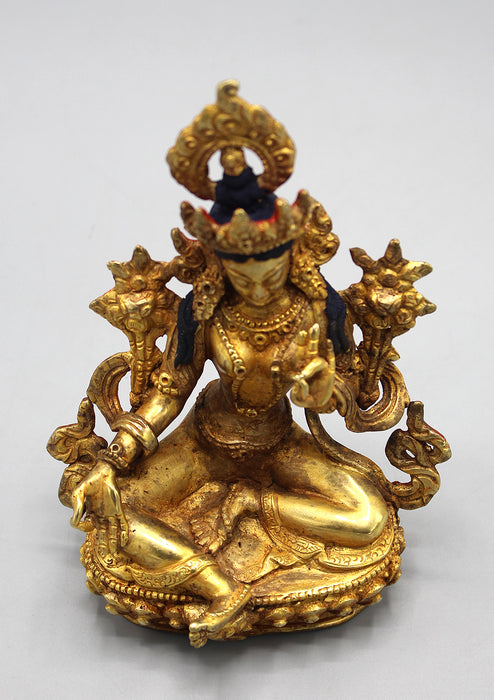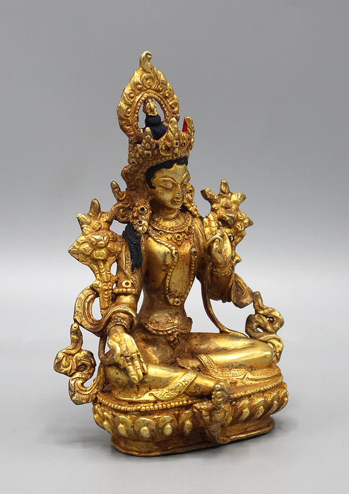 This is a gold plated Green Tara Statue which is completely hand crafted in Nepal. Nepalese sculptures are popular around the world since they are made with genuine ancient techniques and with the expertise of skilled craftspeople. Our sculptor is a fourth generation artist whose family has been sculpting for over a century now.