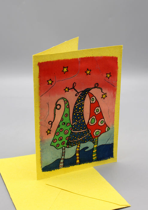 This is a Fair Trade Greeting card with a batik print done on cotton fabric and glued to a lokta paper greeting card.