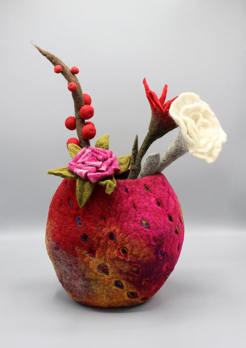 This lovely felted flower basket is a soft and unique product to beautify your home. You can simply pop up some flowers and keep in the desired place. This listing contains one felt vase and three felt colorful flowers. The flowers are colorful.