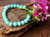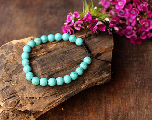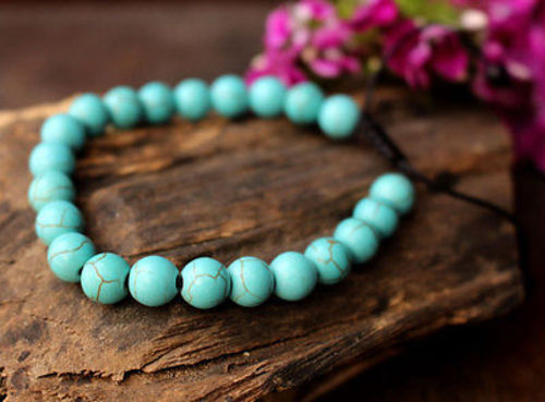 This is an adjustable Tibetan Wrist Mala made of Light Faux Turquoise strung together in an adjustable nylon thread. The bracelet looks very catchy and has all the qualities of being called a unique, fashionable, chic, boho, beautiful bracelet.