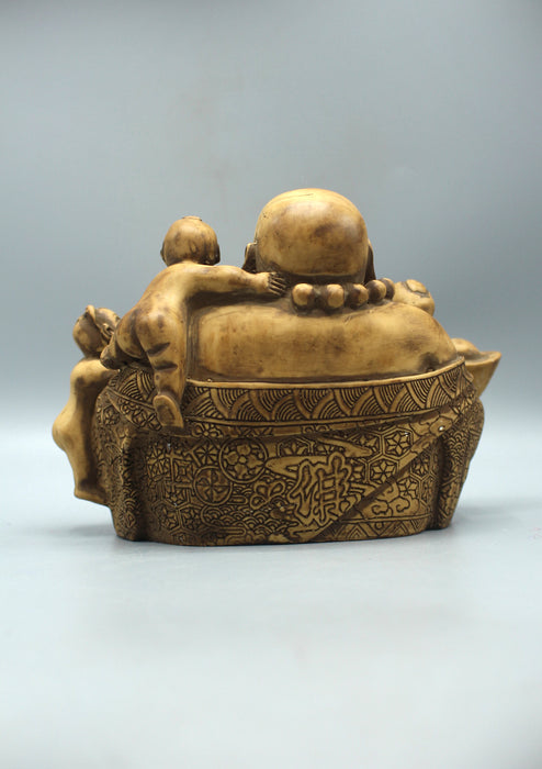 This is a beautiful resin statue of Laughing Buddha Sitting with Five Children . The statue is toned with Cream brown color.This Buddha symbolizes good luck in starting a wholesome family that is always filled with laughter and happiness. This Buddha fills the family with laughter and happiness when starting a new and gives the ability to parents to control any rebellious children within the household.