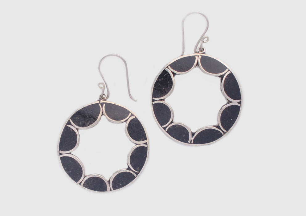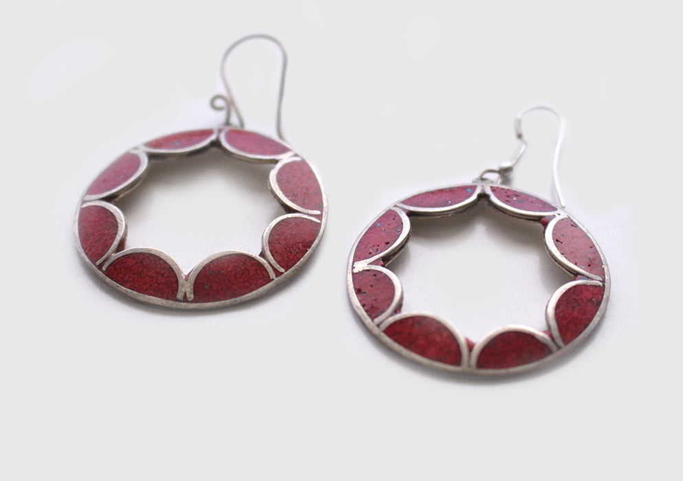 These are the beautifully made white metal earrings. The earrings is handmade and inlaid with Resin Black Onyx, Coral and Turquoise . The earrings is in flower shaped with hollow design.