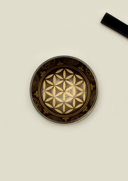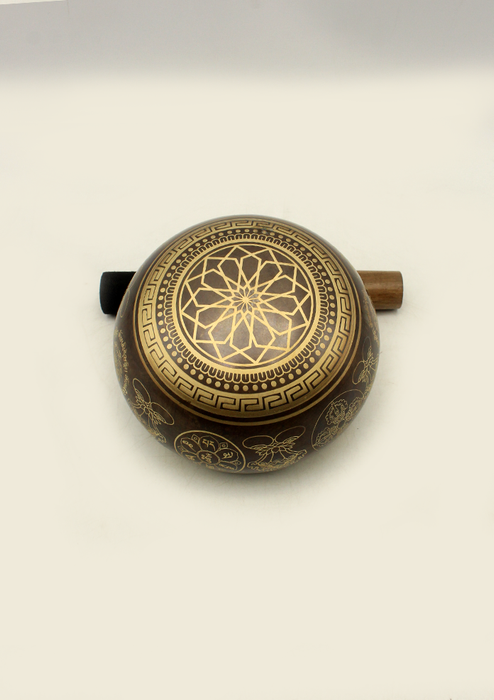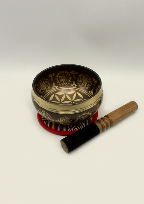 This beautifully crafted singing bowl features an engraving of the Flower of Life, surrounded by Metatrons cube moon phases and Shri Yantra, all finely printed. The exterior is adorned with additional intricate patterns, Om Mani mantra, and symbols such as Double Dorjee, Dharmawheel, all meticulously etched. The bowl comes with a wooden striker and a colorful cushion, making it both a beautiful and functional piece for meditation and spiritual practices.