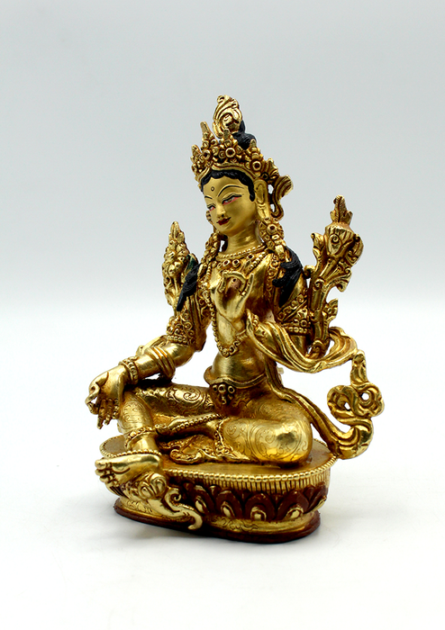 A full gold-plated copper Green Tara statue from Patan is a remarkable piece of Buddhist art and craftsmanship. It is a testament to the artistic mastery, devotion, and cultural heritage that continues to thrive in the region. It serves as object of devotion, aid to meditation, and reminder of the qualities and teaching represented by the depicted deity.