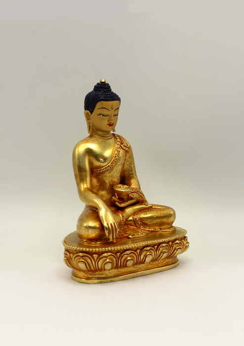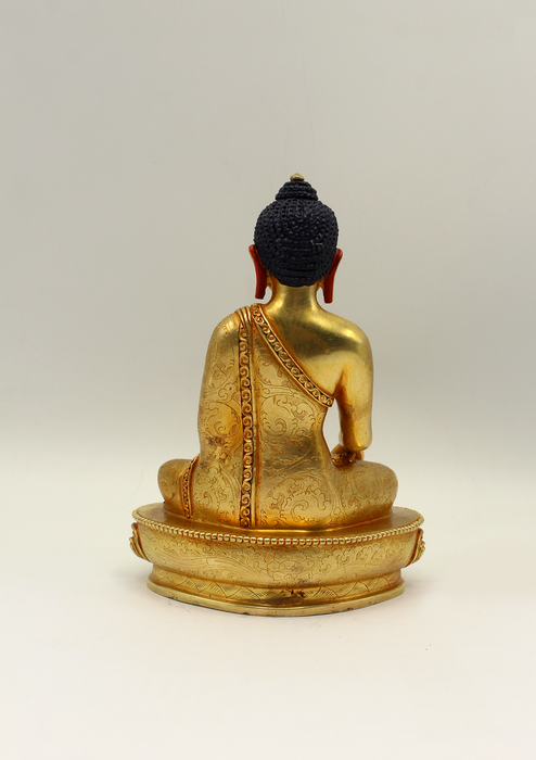 This 5.5-inch tall statue of Shakyamuni Buddha features full gold plating and intricate carvings of Lotus and floral motifs adorning the Buddha's robe.