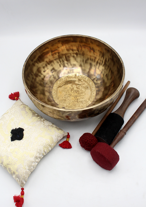 Immerse yourself in a realm of tranquility and spiritual resonance with our exquisite Singing Bowl featuring the captivating Green Tara deity, harmoniously attuned to the serene musical note B. Meticulously handcrafted from premium metal alloys, this bowl is not merely an instrument, but a masterpiece that appeals to both the senses and the soul. The intricate depiction of the Green Tara adds a profound aesthetic and spiritual dimension, making it a stunning focal point for meditation and relaxation. Included in this set are two meticulously crafted drum sticks of varying sizes, meticulously designed to coax an array of harmonious tones from the bowl. The set is also complete with a carefully crafted mallet, ensuring the perfect balance between beauty and sound clarity, while the accompanying cushion provides stability and comfort during your sonic journeys. Whether you're an avid meditator, sound therapy enthusiast, or seeker of serenity, this Singing Bowl harmonizes visual elegance with auditory delight, serving as a timeless conduit to inner calm and balance.