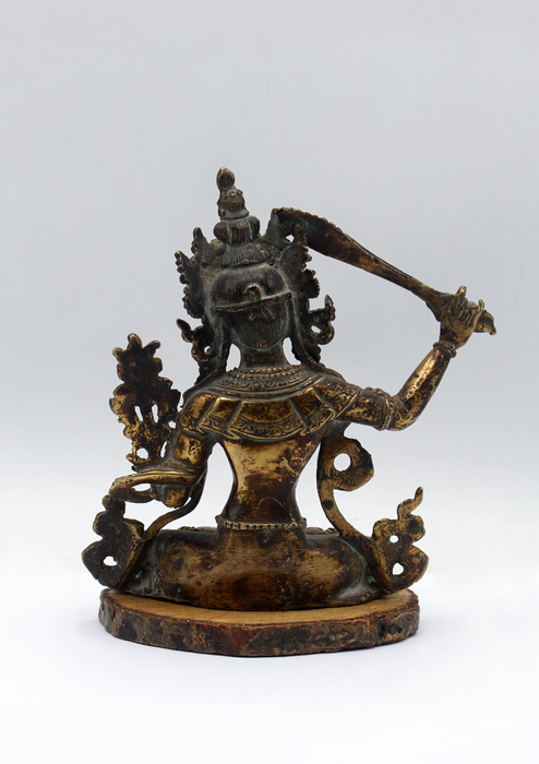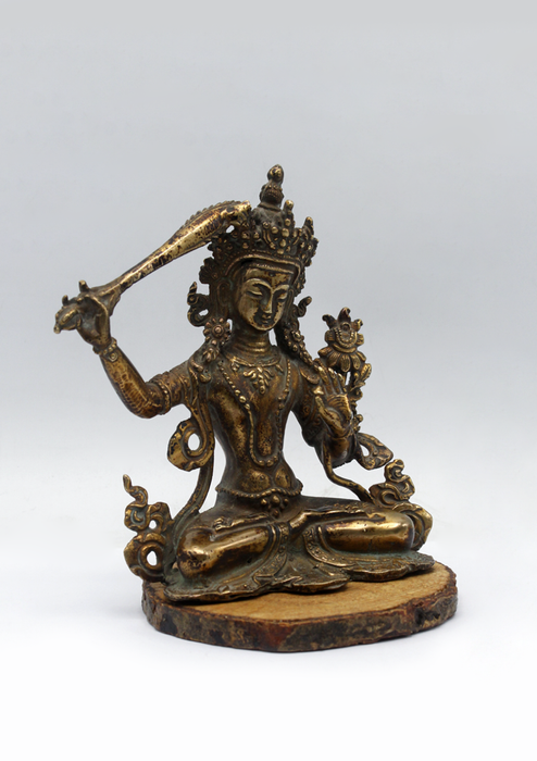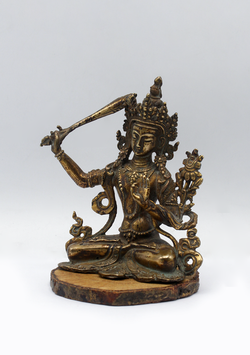 This beautifully crafted Manjushri statue depicts the embodiment of wisdom, holding a flaming sword in one hand to cut through ignorance and a lotus supporting the Prajnaparamita sutra in the other. The intricate detailing, combined with a serene expression, represents clarity of mind, knowledge, and insight.