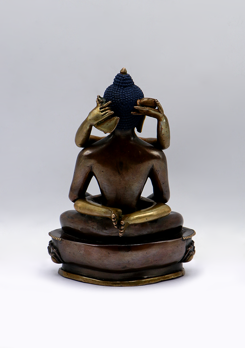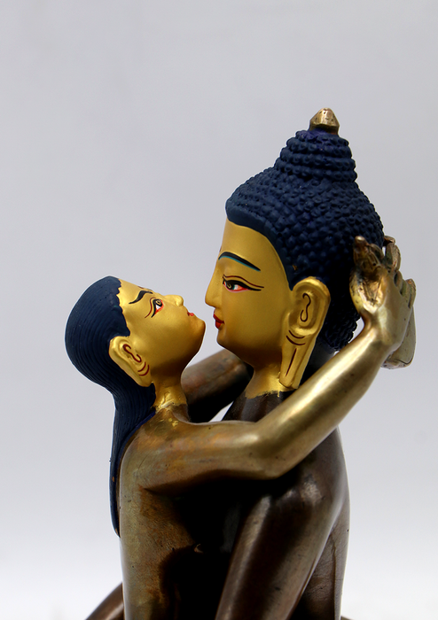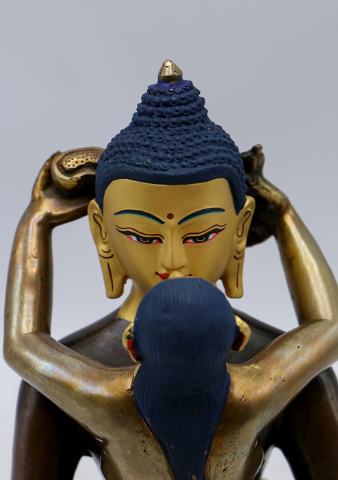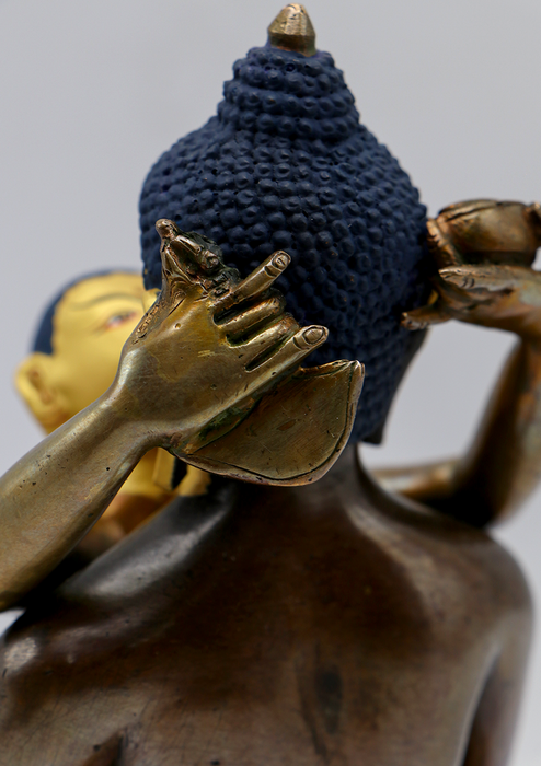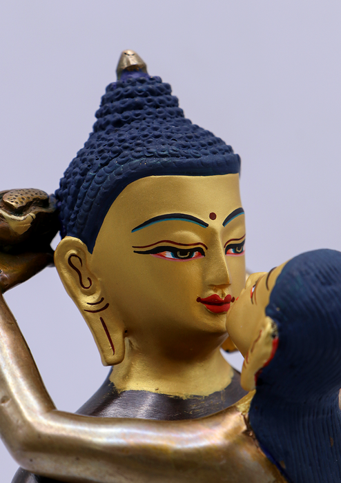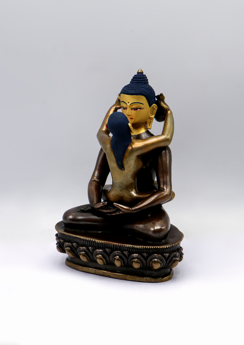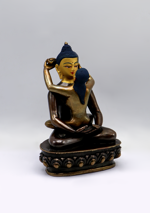 This captivating statue depicts Buddha Samantabhadra in union with his consort, symbolizing the inseparable unity of wisdom and compassion. Expertly handcrafted from copper, the statue features a beautifully hand-painted gold face that radiates serene expression and spiritual presence.